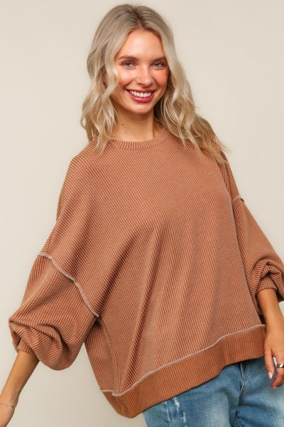 REVERSE BOTTOM BAND WASHED WAVY RIB SOLID KNIT TOP