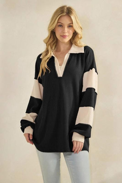 LONG SLEEVE MANDARIN COLLAR SOLID URBAN RIB CONTRAST TOP PLUS