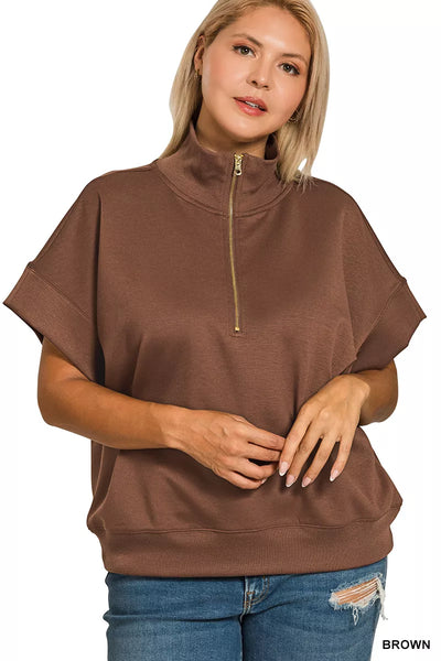 This scuba high neck half zip short sleeve pullover top offers a modern and sporty style. The high neck design provides a sleek and chic look. Featuring a half zip for added detail and versatility, this top is both functional and fashionable. With short sleeves, it is perfect for layering or wearing on its own. Stay comfortable and on-trend with this versatile and contemporary piece.
